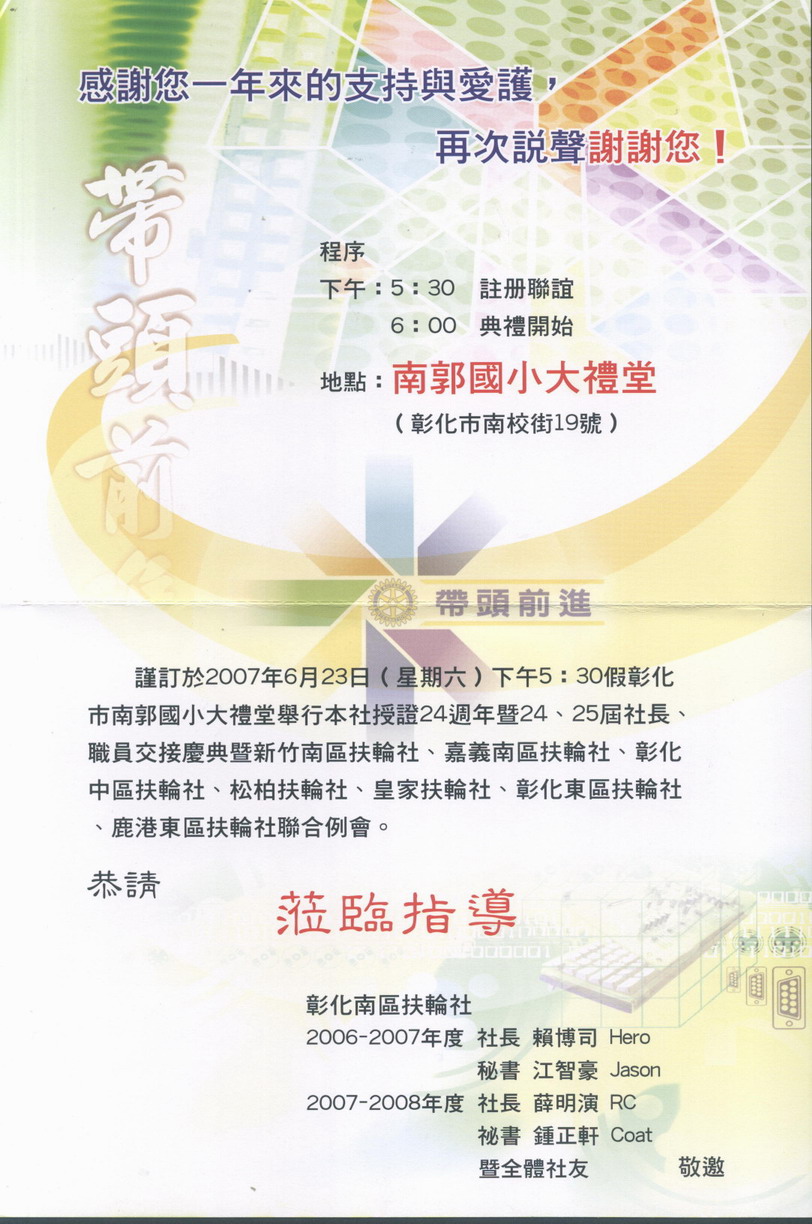 2007年06月23日星期六下午, 彰化南區扶輪社授證24週年慶暨第24-25屆社長職員交接典禮,